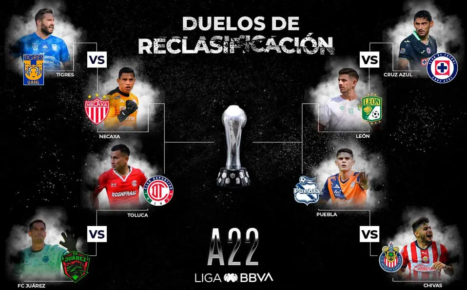 El domingo quedaron definidos los partidos de los ocho equipos clasificados al Repechaje del Torneo Apertura 2022, y este lunes a mediodía, la Liga MX a través de un comunicado dio a conocer los días y horarios en los que se disputarán las series por los cuatro boletos a los Cuartos de Final. Cabe recordar que América, Monterrey, Santos y Pachuca son los clubes que consiguieron su pase directo, al terminar en los primeros cuatro lugares de la tabla general, por lo que están a la espera de conocer a sus rivales. Horarios del Repechaje del Apertura 2022 (5) Tigres vs Necaxa (12) | Sábado 8 de octubre, 19:00 horas en el Estadio Universitario de Nuevo León. (6) Toluca vs FC Juárez (11) | Domingo 9 de octubre, 12:00 horas en el Estadio Nemesio Diez del Estado de México. (7) Cruz Azul vs León (10) | Sábado 8 de octubre, 21:15 horas en el Estadio Azteca de la Ciudad de México. (8) Puebla vs Guadalajara (9) | Domingo 9 de octubre, 16:30 horas en el Estadio Cuauhtémoc de Puebla.